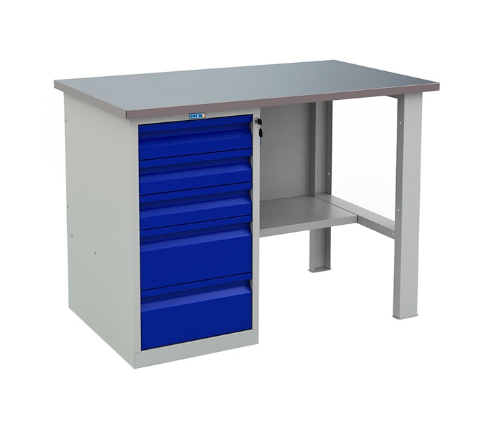В данную комплектацию входит: столешница WT-120, опора WF-1, полка/стенка WSh-120/1, тумба Рrofi WD-5. Столешница изготовлена из плиты МДФ толщиной 24 мм и оцинкованного листа металла толщиной 1,2 мм. Столешница имеет отверстия для крепления к тумбе и опоре. Опора WF-1 не регулируемая по высоте. Имеет нижнюю перекладину для усиления устойчивости конструкции. Полка и стенка устанавливается между опорой и тумбой верстака. Тумба Profi WD-5 комплектуется пятью выдвижными ящиками оборудованными телескопическими направляющими, которые обеспечивают 100% выдвижения ящиков. Полезные размеры ящиков (ВхШхГ) 3 верхние - 100х380х600 мм, 2 нижних- 190х380х600 мм. Тумба WD-5 закрывается центральным ключевым замком Практик. Цвет: корпус - серый Ral 7038, ящики и двери тумб - синий Ral 5002. Верстак поставляется в разобранном виде.