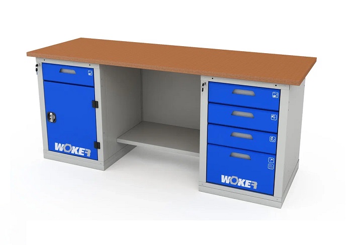 В комплектацию верстака входит: столешница Woker 2000, одна тумба Woker 02, одна тумба Woker 04, полка и стенка Woker. Столешница выполнена из шлифованной березовой многослойной фанеры толщиной 30 мм. Снаружи фанера обработана влагостойким антисептиком цвета "красное дерево", что придает фанере повышенную влагостойкость и более темный цвет. Тумба Woker 02 имеет одну регулируемую по высоте полку (шаг 50 мм). Полка тумбы установлены на стальные салазки, которые позволяют выдвигать полку на себя на 70% для облегчения разгрузки/погрузки. Дверь тумбы закрывается на цилиндрический замок со стальной поворотной ручкой, секретность замка 2000 комбинаций. Открывание двери на 180 градусов. Тумба Woker 04 комплектуется 4 выдвижными ящиками (3 высотой - 135 мм и 1 высотой - 275 мм). Полезный размер ящика: (ШхГ) 459х612 мм. В ящиках есть противоскользящие коврики и набор наклеек с пиктограммами для маркировки содержимого. Полка/стенка выполнена из стального листа толщиной 1 мм. Выдерживает нагрузку -30 кг.